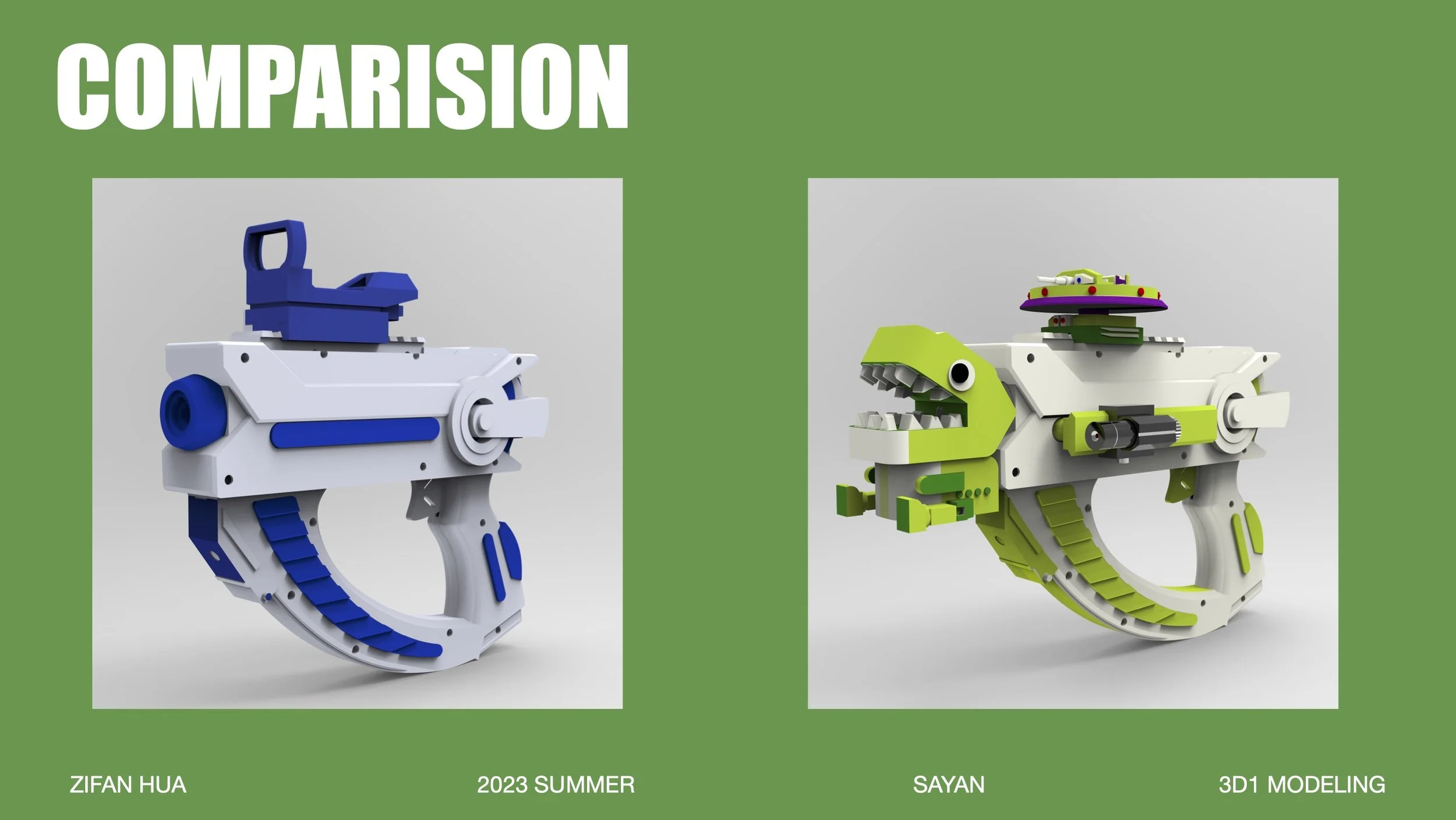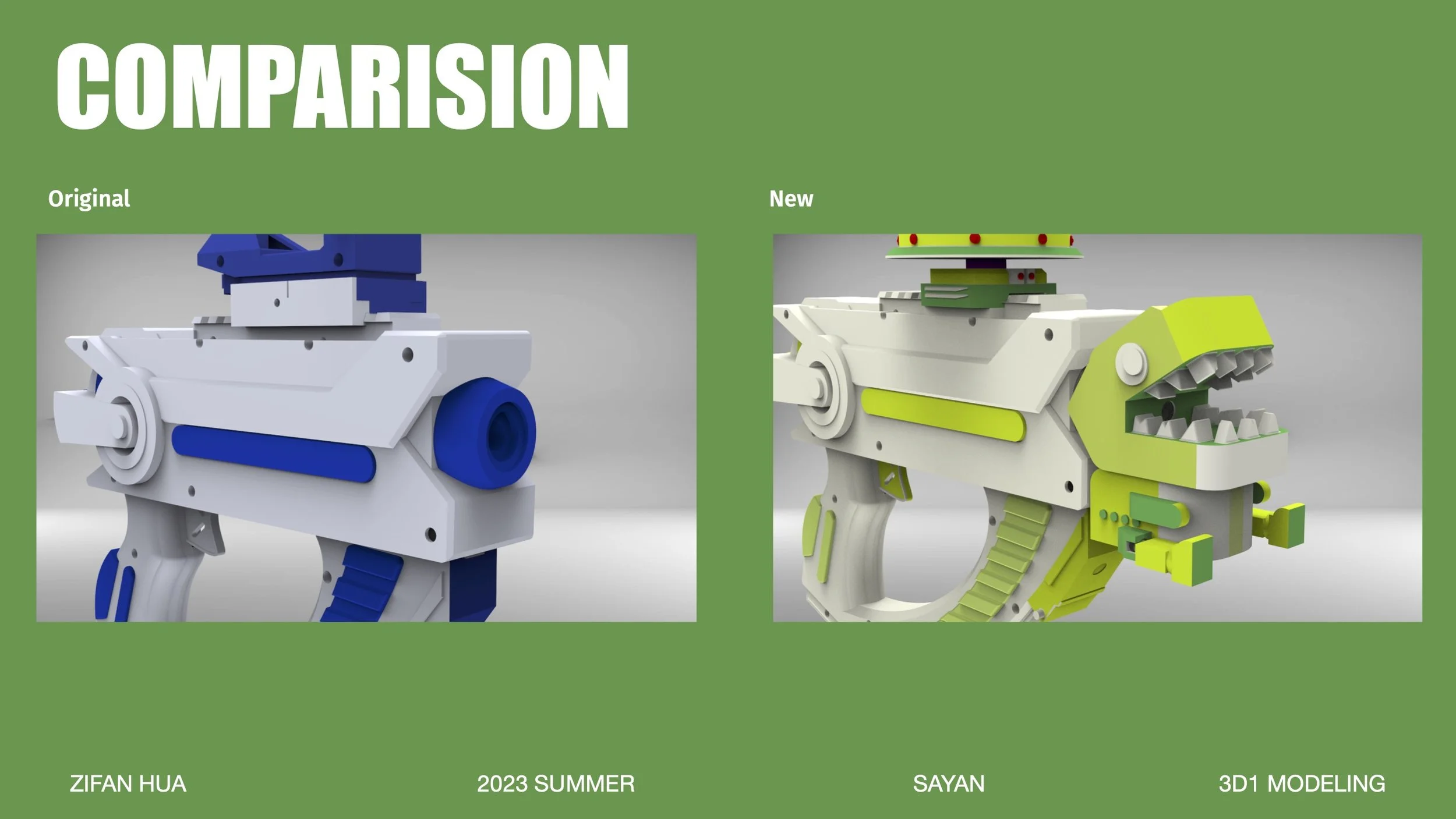 This project focuses on redesigning the water pistol by disassembling the structure of the original water pistol to understand the principle of the water pistol, and 3D printing the assembled