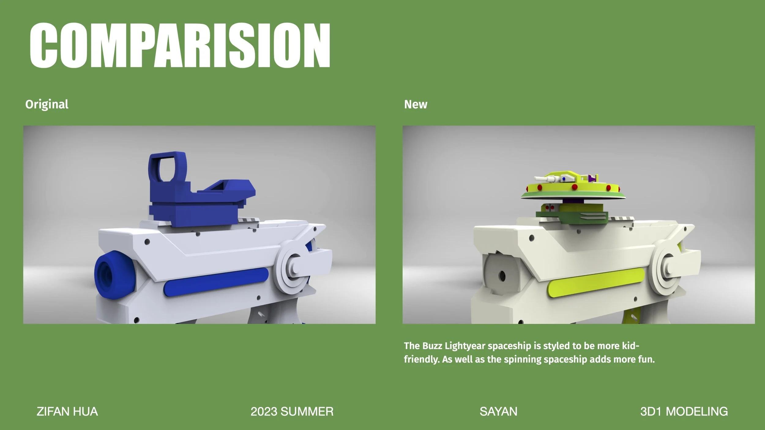 Using the character from Toy Story (Buzz Lightyear) as inspiration for the redesign of the water gun's